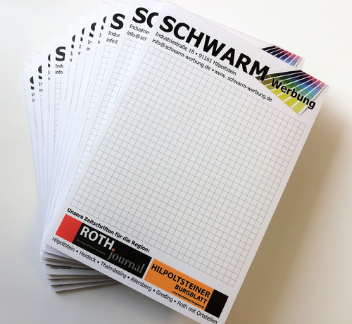 Block DIN A5, 25 Blatt; 80g/qm Naturpapier weiß (beschreib- und bestempelbar); 4/0 farbig einseitig bedruckt; Rückpappe grau (1 mm stark); Leimbindung an der kurzen Seite (kopfgebunden)