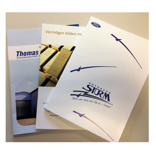 Prospektmappen A4außen bedruckt; Hochwertige Mappe für DIN A4, 2-teilig mit 2 Laschen und Visitenkartenschlitz, 4/0 farbig (Außenseite bedruckt), 0,40